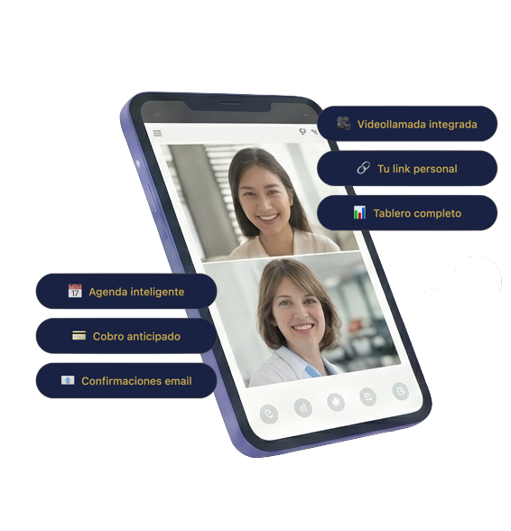 Una sola vezTu paciente agenda y paga. La videollamada se crea sola. Se envían emails automáticos con confirmación y archivo para conectar al calendario de ambos.